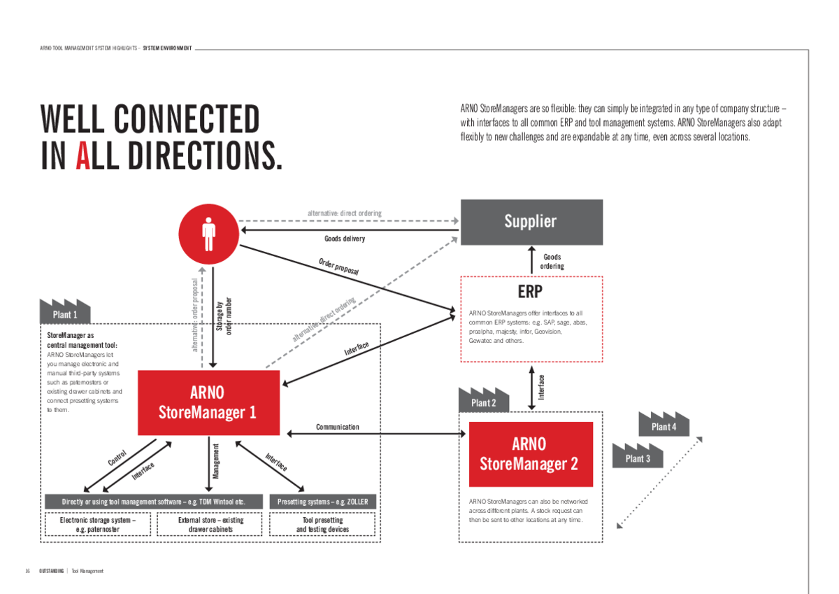 ARNO StoreManager настолько гибкие, что могут быть легко интегрированы в корпоративные структуры любого типа - при помощи интерфейсов для всех распространенных ИСУП и систем управления инструментами. Кроме того, системы ARNO StoreManager легко адаптируются к новым задачам и могут быть расширены в любое время, даже в разных местах.